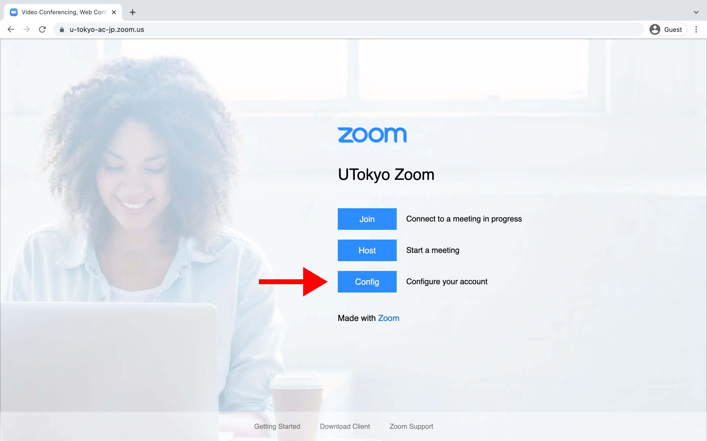 2. A page labeled “UTokyo Zoom” will appear. Click the “Config” button on this page.