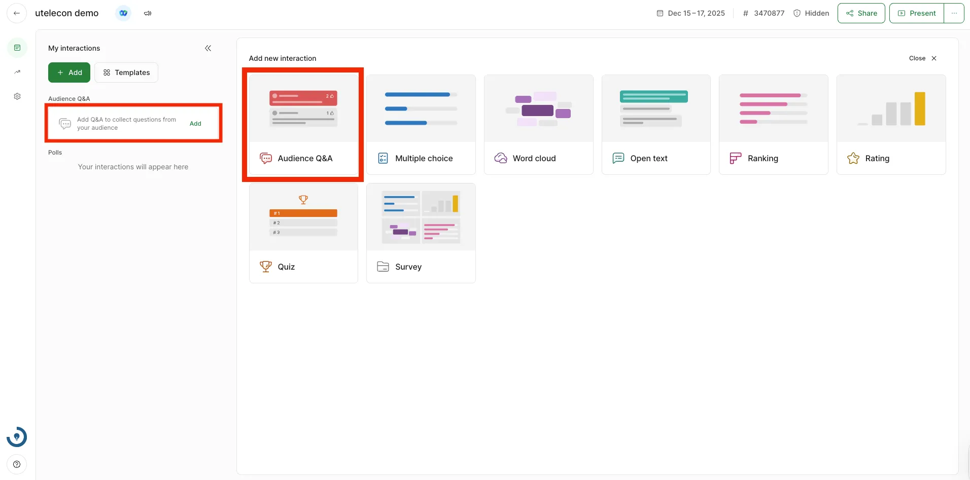 To create a Q&A, select “Audience Q&A” in the upper left corner of the screen or under “Add new interaction”.