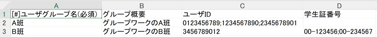 • 複数のユーザグループを一度に登録する場合や,履修者の共通IDや学生証番号についての電子データが手元にある場合に適しています.