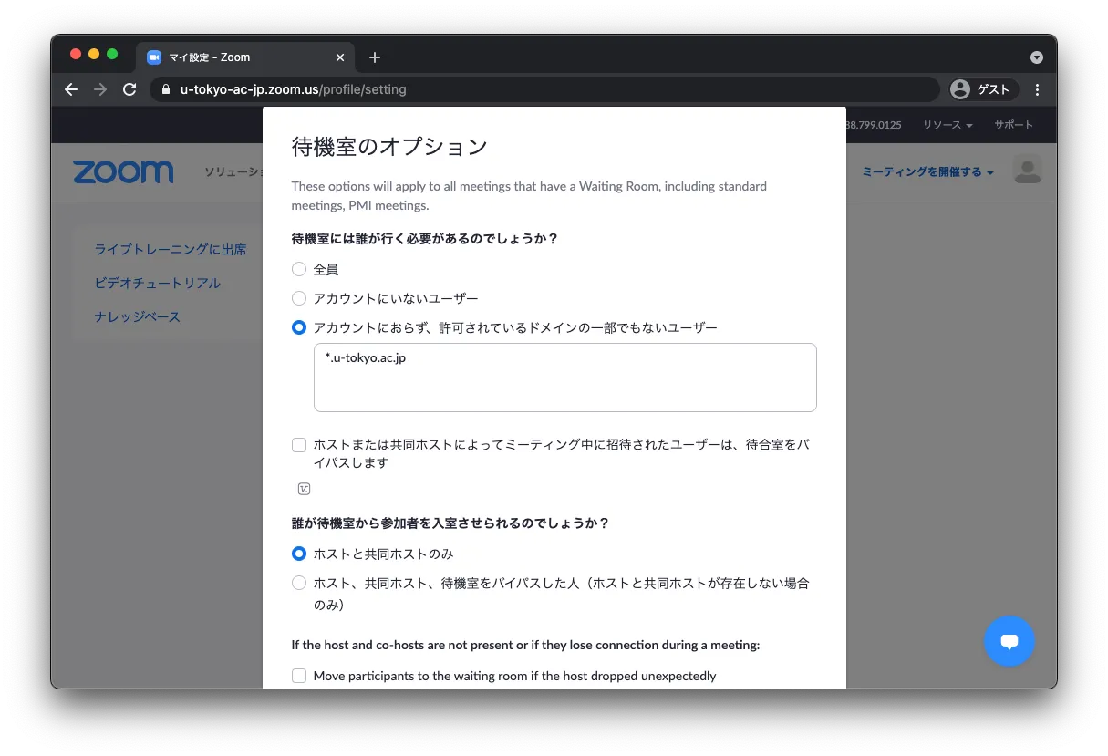 • 「アカウントにおらず、許可されているドメインの一部でもないユーザー」を選択した場合: 東京大学のZoomアカウントでサインインされている参加者に加えて,特定のドメインのメールアドレスでZoomにサインインしている参加者は,自動的に入室が許可されます.オンライン授業においては,この設定にした上で,入力欄に*.u-tokyo.ac.jpを入力することを推奨します.