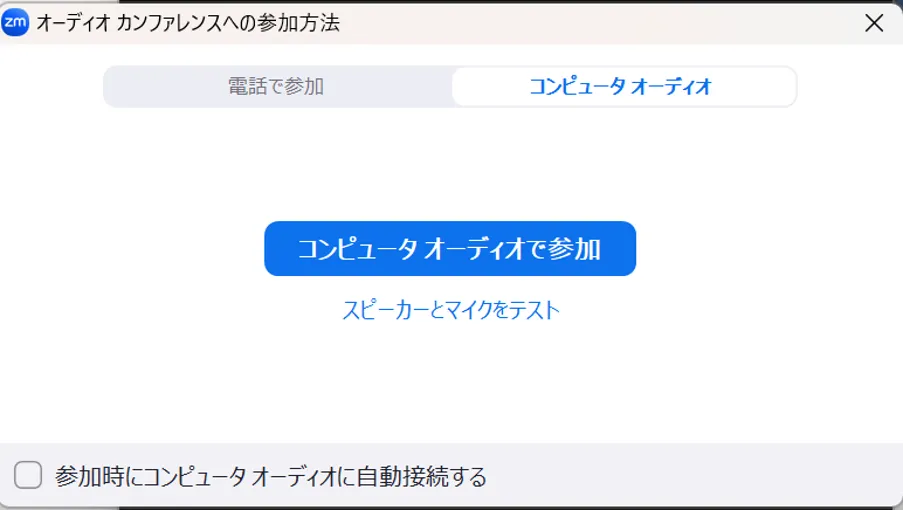 • ミーティングに入室した後でオーディオ接続を求められた場合,オーディオの設定を行い,「コンピューターオーディオで参加」を押してください.
