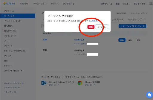2. 「削除」を押すと,ミーティングを削除できます.
