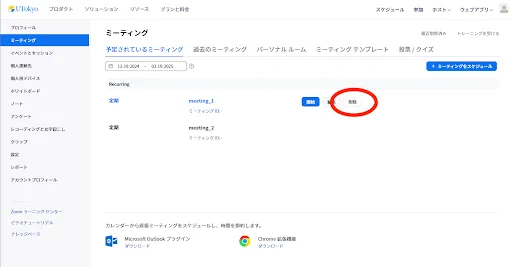 1. ミーティング管理の画面で詳細タブの下部にある「削除」を押してください.